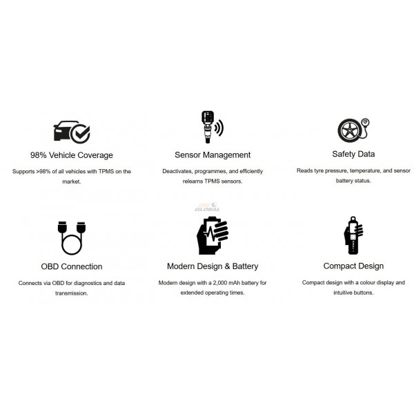 Z obsežno notranjo bazo podatkov, ki pokriva več kot 98 % vseh modelov vozil, naprava ponuja maksimalno prilagodljivost – ne glede na proizvajalca senzorjev. Ne le bere ID-je senzorjev, temveč jih lahko tudi aktivira, programira in klonira, kar znatno olajša sezonsko menjavo pnevmatik.