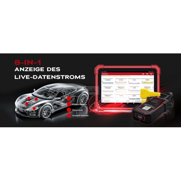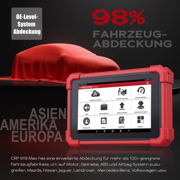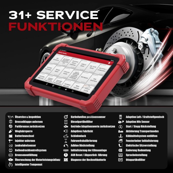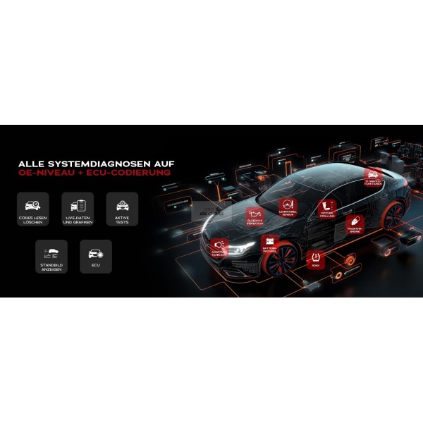 Diagnostični skener za več znamk s popolno sistemsko pokritostjo za več kot 80 znamk avtomobilov, vključno s funkcijami, kot so branje/brisanje kod težav z definicijami, aktivacija in testiranje komponent, standardna diagnostika OBD in 31 najpogostejših posebnih servisnih funkcij, kodiranje in prilagoditev.