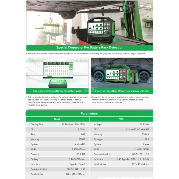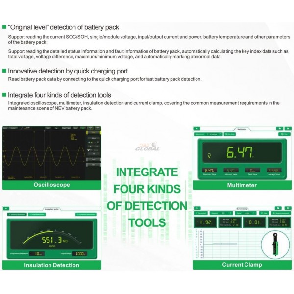iSmartEV P03 je celovit inteligentni detektor za električna vozila. Naprava združuje funkcije zaznavanja baterije električnega vozila in zaznavanja sistema vozila ter vključuje osciloskop, multimeter, tester izolacije in tokovne klešče. Kot profesionalni in celovit tester električnih vozil je prva izbira za servisne centre!